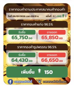 ราคาทองวันนี้ 6 มกราคม 2569 ประกาศครั้งที่ 1