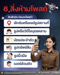 วันที่ 21 พฤศจิกายน 2568 มีรายงานว่า เพจเฟซบุ๊ก ตำรวจไซเบอร์ – บช.สอท. ได้มีการโพสต์ภาาพและข้อความเตือนระบุว่า 6 สิ่งที่ไม่ควรโพสต์ลงโซเชียล! ระวังข้อมูลหลุด เสี่ยงถูกมิจฉาชีพเล่นงาน