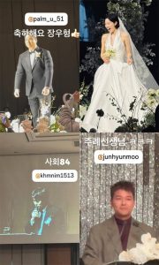 งานแต่งงานครั้งนี้เต็มไปด้วยดาราชื่อดังมากมาย โดยเฉพาะอย่างยิ่งนักแสดงจากรายการ ‘I Live Alone’ กลับมารวมตัวกันอีกครั้ง จุนฮยอนมูเป็นผู้ดำเนินรายการ โดยมีเคียน84 รับหน้าที่พิธีกร ที่สำคัญ นี่เป็นครั้งแรกที่จุนฮยอนมูได้มาเป็นพิธีกรในงานแต่งงาน ทำให้ช่วงเวลานี้มีความหมายมากยิ่งขึ้นสำหรับเพื่อนสนิทและอดีตนักแสดงร่วมของเขา
