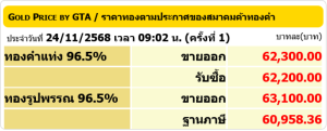 สำหรับราคาทองคำเปิดตลาดประจำวันที่ 24 พฤศจิกายน 2568 เปิดตลาดปรับลง 150 บาท ในครั้งที่1 โดยทองรูปพรรณขายออกบาทละ 63,100 ตามข้อมูลจากเว็บไซต์ของ สมาคมค้าทองคำ เมื่อเวลา 09.02 น.