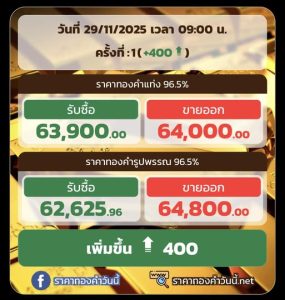 ราคาทองวันนี้ 29 พฤศจิกายน 2568 โดยสมาคมค้าทองคำ ประกาศราคาทองครั้งที่ 1 (เปิดตลาด) เมื่อเวลา 09.00 น. ปรับตัวเพิ่มขึ้นพรวดเดียว 400 บาท เมื่อเทียบกับราคาซื้อขายครั้งสุดท้ายของเมื่อวาน(ศุกร์) ที่ระหว่างวันมีการประกาศราคาทองทั้งหมด 15 ครั้ง รวมราคาปรับตัวเพิ่มขึ้น 150 บาท สู่บริเวณ 63,600 บาท
