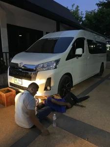 ต่อมาลูกศิษย์จึงได้ช่วยกันนำแม่แมวและลูกแมวทั้ง 4 ตัว ออกจากใต้ท้องรถอย่างปลอดภัย