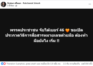 จากกรณี ไอซ์ รักชนก ศรีนอก ได้ออกมาโพสต์ข้อความผ่านเฟซบุ๊ก รักชนก ศรีนอก โดยระบุว่า พรรคประชาชน จับได้เบอร์ 46 ขอเปิดประกวดวิธีการสื่อสารหมายเลขด้วยมือ ต้องทำมือยังไง เริ่ม
