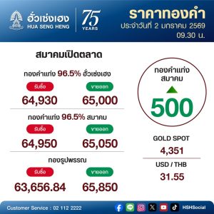 ราคาทองคำวันนี้ 2 มกราคม 2569 (ประกาศครั้งที่ 1)