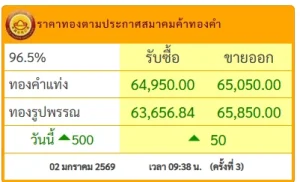 ราคาทองวันนี้ 2 มกราคม 2569 โดย สมาคมคเาทองคำ ประกาศราคาทองครั้งที่ 1 (เปิดตลาด) เมื่อเวลา 09.04 น. ปรับตัวขึ้นแรง 500 บาท เมื่อเทียบกับประกาศราคาซื้อขายครั้งสุดท้ายของเมื่อวาน(พฤหัสบดี) ที่ระหว่างมีการประกาศราคาทองคำเพียงครั้งเดียวตอนเปิดตลาดที่ปรับตัวลงแรง 400 บาท สู่บริเวณ 64,550 บาท