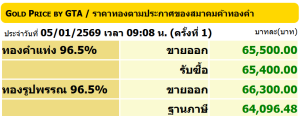 ราคาซื้อขายทองคําในประเทศชนิด 96.5% วันจันทร์ ที่ 5 มกราคม 2569 (ประกาศครั้งที่ 1)