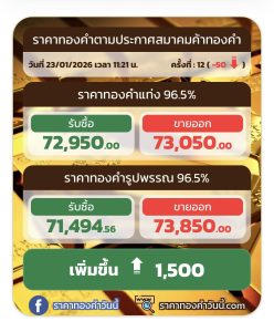 ‘วันที่ 23/01/2026 เวลา 11:21 น. ราคาทองคำตามประกาศสมาคมค้าทองดำ องคำ ครั้งที่: 12 ครั้งที่:12(-50 12(-50 -50 ราคาทองคำแท่ง 96.5% รับซื้อ 72,950.00 ขายออก 73,050.00 ราคาทองคำรูปพรรณ 96.5% รับซื้อ 71,494.5 .56 ขายออก 73,850.00 เพิ่มขึ้น f 1,500 ราคาทองคำวันนี้ www ราคาทองคำวันนี้.’