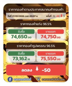 อัปเดตราคาทองล่าสุดวันนี้ 27 มกราคม 2569 หลังเช้านี้ สมาคมค้าทองคำ ประกาศราคาทองครั้งที่ 1 (เปิดตลาด) เมื่อเวลา 09.07 น. ปรับลง 50 บาท บริเวณ 74,750 บาท