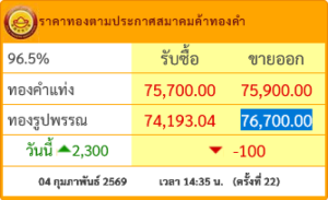 ราคาทองคำประจำวันที่ 4 ก.พ.2569 ดีดแรง 2,300 บาท เปรียบเทียบกับราคาสุดท้ายของวันที่ 3 ก.พ.ที่ผ่านมา โดยราคาทองรูปพรรณขยับมาอยู่ที่บาทละ 76,700.00 บาท อ้างอิงข้อมูลล่าสุดจาก สมาคมค้าทองคำ ที่เผยแพร่ผ่านทางเว็บไซต์ เมื่อเวลา 14:35 น.ครั้งที่ 22