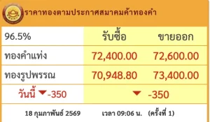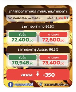 ราคาทองคำวันนี้ 18 กุมภาพันธ์ 2569 โดย สมาคมค้าทองคำ ประกาศราคาทองครั้งที่ 1 (เปิดตลาด) เมื่อเวลา 09.06 น. ปรับตัวลงหนัก 350 บาท สู่บริเวณ 72,600 บาท