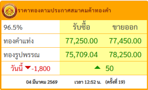 ราคาทองคำบ่ายวันนี้ (4 มีนาคม 2569) ปรับครั้งที่ 19