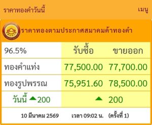ราคาทองคำวันนี้ 10 มีนาคม 2569 โดย สมาคมค้าทองคก ประกาศราคาทองครั้งที่ 1 (เปิดตลาด) เมื่อเวลา 09.02 น. ปรับตัวเพิ่มขึ้น 200 บาท สู่บริเวณ 77,600 บาท