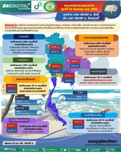 วันที่ 22 ส.ค. 2568 พยากรณ์อากาศ 24 ชั่วโมงข้างหน้า ประเทศไทยมีฝนตกหนักบางแห่ง โดยมีฝนตกหนักมากบางพื้นที่บริเวณภาคตะวันออก ขอให้ประชาชนโดยเฉพาะบริเวณจังหวัดสกลนคร นครพนม นครราชสีมา จันทบุรี และตราด ระวังอันตรายจากฝนตกหนักถึงหนักมากและฝนตกสะสมที่อาจเกิดขึ้นในระยะนี้ไว้ด้วย เนื่องจากมรสุมตะวันตกเฉียงใต้ ที่พัดปกคลุมทะเลอันดามัน ประเทศไทย และอ่าวไทยมีกำลังปานกลาง ประกอบกับมีหย่อมความกดอากาศต่ำปกคลุมบริเวณประเทศลาวตอนบน และเวียดนามตอนบน