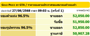 สำหรับราคาทองคำเปิดตลาดประจำวันที่ 27 สิงหาคม 2568 เปิดตลาดปรับขึ้น 200 บาท ในครั้งที่1 โดยทองรูปพรรณขายออกบาทละ 52,850 ตามข้อมูลจากเว็บไซต์ของ สมาคมค้าทองคำ เมื่อเวลา 09.03 น.