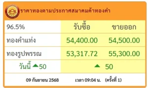 ราคาทองคําประจำวันอังคารที่ 9 กันยายน 2568 ประกาศครั้งที่ 1 (เปิดตลาด) เมื่อเวลา 09.04 น. เพิ่มขึ้น 50 บาท บาท สูงสุดใหม่รอบ 5 เดือน บริเวณ 54,500 บาท