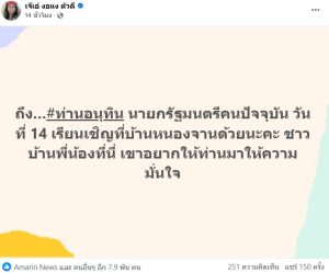 ล่าสุด ได้ออกมาโพสต์ข้อความถึงนายกฯว่า “ถึง…#ท่านอนุทิน นายกรัฐมนตรีคนปัจจุบัน วันที่ 14 เรียนเชิญที่บ้านหนองจานด้วยนะคะ ชาวบ้านพี่น้องที่นี่ เขาอยากให้ท่านมาให้ความมั่นใจ”