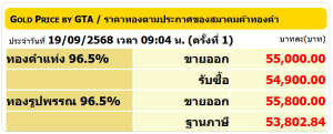 ราคาซื้อขายทองคําในประเทศชนิด 96.5% วันศุกร์ที่ 19 กันยายน 2568 (ประกาศครั้งที่ 1)