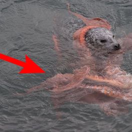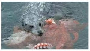 หนุ่มนักว่ายน้ำรีบเข้าไปช่วย หลังเห็นคล้ายลูกสุนัขกำลังจมน้ำกลางทะเล กลายเป็นคลิปช็อก… ความจริงคือแมวน้ำกำลังล่าเหยื่อ ปลาหมึกยักษ์อยู่ในปากมัน!