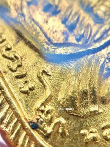 กระแสการปั้มครบถ้วน ตัวตัดถูกต้อง พระองค์นี้ใช้แม่พิมพ์ด้านหลังเป็นบล็อคผ่าปากหลังวงเดือนซื้งเราไม่เคยเห็นกัน ตอนแรกผมไปเทียบแค่บล็อคไม่ผ่าปากหลังวงเดือนธรรมดาจะทำให้เราดูพระองค์นี้เพี้ยนทันที เป็นปกติมากๆที่พระของวัดช้างไห้จะสลับแม่พิมพ์หน้า-หลังกันมาปั้มเราเห็นได้จากหลายๆพิมพ์ทั้งรุ่น2-3-4 อันนี้ไม่แปลกเลย จุดสังเกตุของผมอีกจุดว่าทำไมถึงไปเทียบกับบล็อคผ่าปากหลังวงเดือน ให้พี่ๆสังเกตุดีๆบนศรีษะอาจารย์ทิมเริ่มมีเส้นแตกที่เกิดจากรอยร้าวของแม่พิมพ์ให้เราเห็นบางๆ(รูปที่ถ่ายมาตอนแรกไม่มีให้เห็น) บล็อคนี้ปกติแล้วที่เราเห็นๆกันจะมีเส้นแตกที่ชัดและหนากว่านี้ ทองคำอาจจะปั้มช่วงนี้ ก่อนที่บล็อคจะร้าวอย่างที่เห็นๆกัน หลังจากปั้มทองคำเหรียญนี้แล้วผมคิดว่าโรงงานน่าจะปั้มจนบล็อคร้าวอย่างที่เราๆเห็นกันชัดๆในบล็อคผ่าปาก