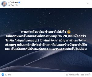 ก่อนจะออกมาโพสต์อีกว่า “ถามคำเดียวน้องผ่านมาได้ยังไง สมัยก่อนพ่อฉันติดแค่หนี้กองทุนหมู่บ้าน 20,000 มั้งถ้าจำไม่ผิด ไม่คุยกับพ่ออยู่ 2 ปี พ่อก็จัดการปัญหาตัวเองได้นะ เก่งสุดๆ กลับมาอีกทีพ่อน่ารักมากไม่เคยสร้างปัญหาให้อีกเลย ฉันเลือกแก้ที่ตัวเองก่อนเลย เพราะตอนนั้นฉันไม่มีเงิน”