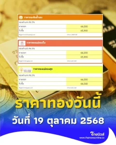 ราคาทองวันนี้ วันที่ 19 ตุลาคม 2568 อ้างอิงจากราคาทองทุกชนิดตามประกาศสมาคมค้าทองคำ ประจำวันที่ 18 ตุลาคม 2568