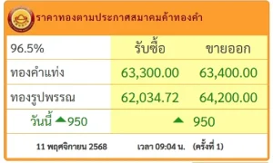 ราคาทองวันนี้อังคารที่ 11 พฤศจิกายน 2568 ประกาศครั้งที่ 1 (เปิดตลาด) เมื่อเวลา 09.04 น. ปรับตัวเพิ่มขึ้น พรวดเดียว 950 บาท สู่บริเวณ 63,400 บาท