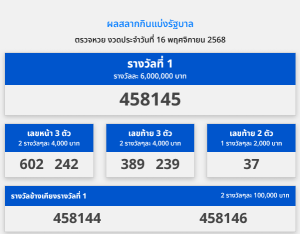 ออกไปเป็นที่เรียบร้อยแล้ว สำหรับผลประกาศรางวัลสลากกินแบ่งรัฐบาล ประจำวันที่ 1 พฤศจิกายน 2568 โดยรางวัลที่ 1 รางวัลละ 6,000,000 บาท ได้แก่ 458145 เลขหน้า 3 ตัว 2 รางวัลๆละ 4,000 บาท ได้แก่ 602 242 เลขท้าย 3 ตัว 2 รางวัลๆละ 4,000 บาท ได้แก่ 389 239 เลขท้าย 2 ตัว 1 รางวัลๆละ 2,000 บาท ได้แก่ 37